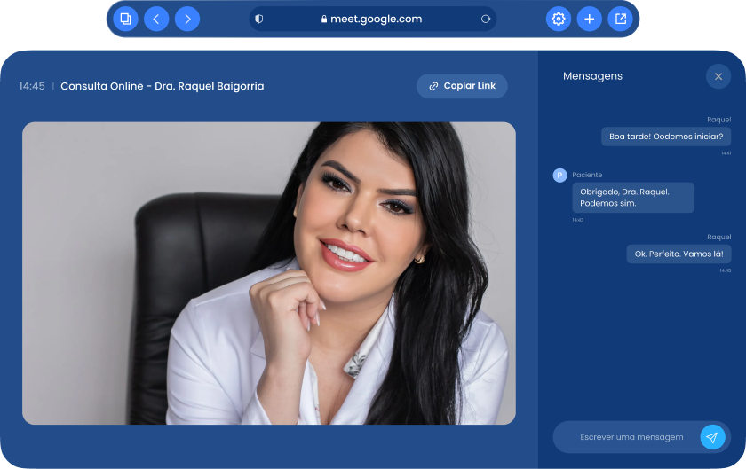 Telemedicina realizada por meio de plataforma audiovisual, sendo possível relatar sintomas, esclarecer dúvidas e, por meio do compartilhamento de tela, apresentar explicações com ajuda de imagens para facilitar o entendimento do paciente.